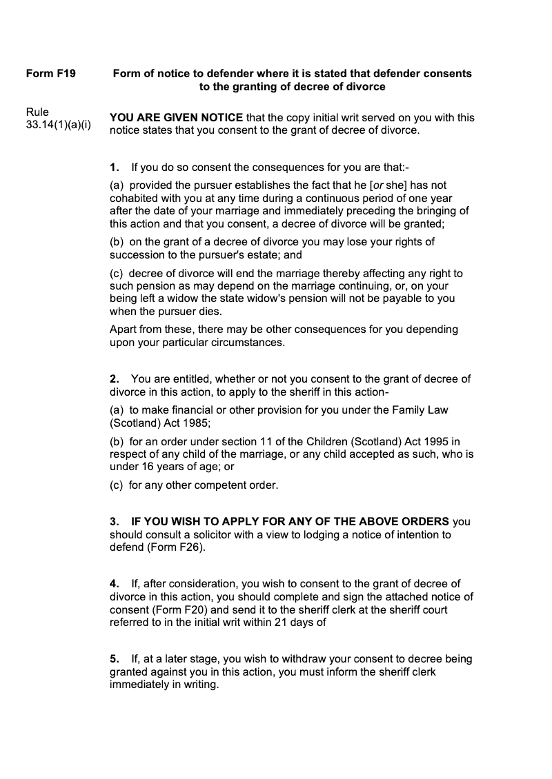 Form of notice to defender where it is stated that defender consents to the granting of decree of divorce