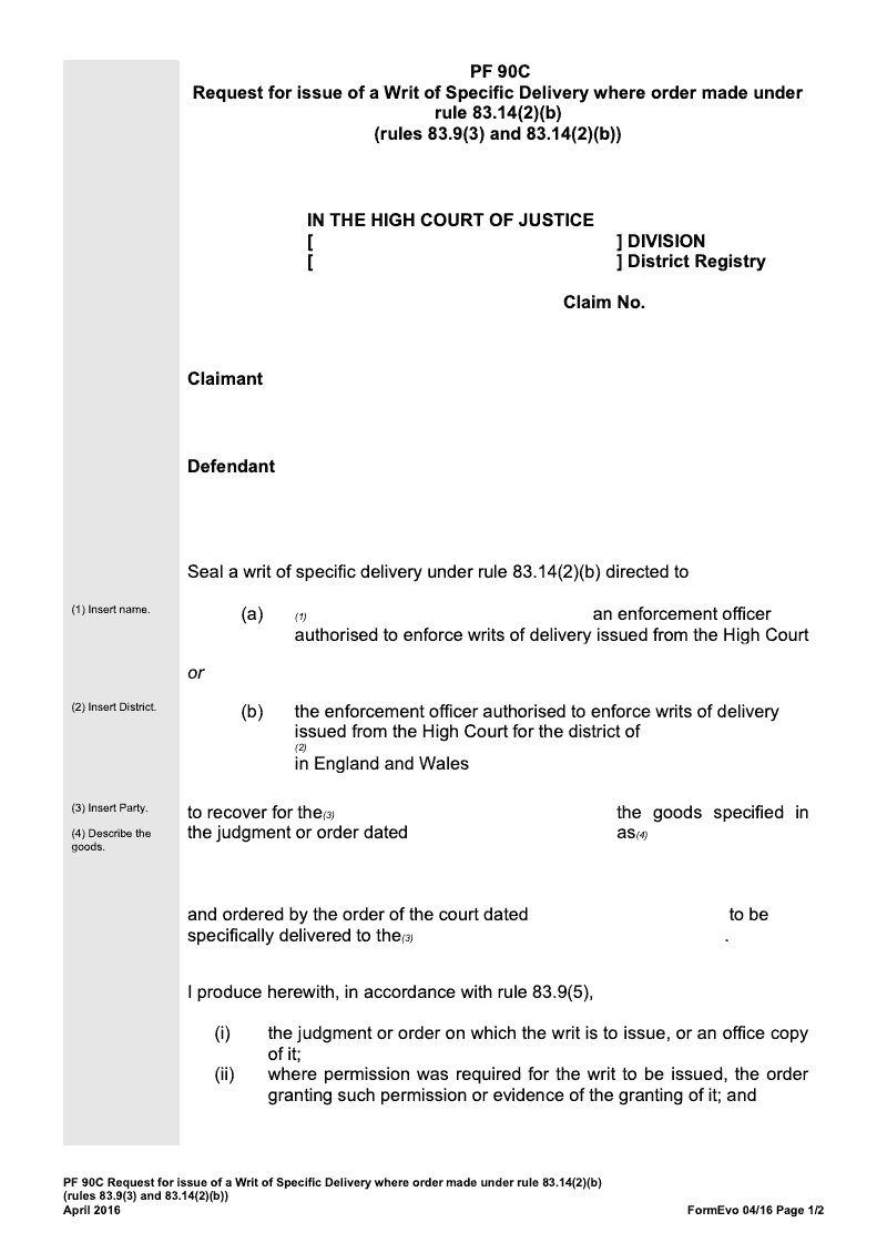 Request for issue of a Writ of Specific Delivery where order made under rule 83.14(2)(b) (rules 83.9(3) and 83.14(2)(b)) - electronic signature available