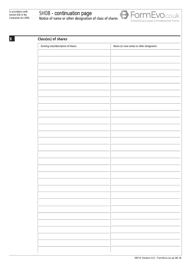 Notice of name or other designation of class of shares continuation page - SH08 (Section 636)